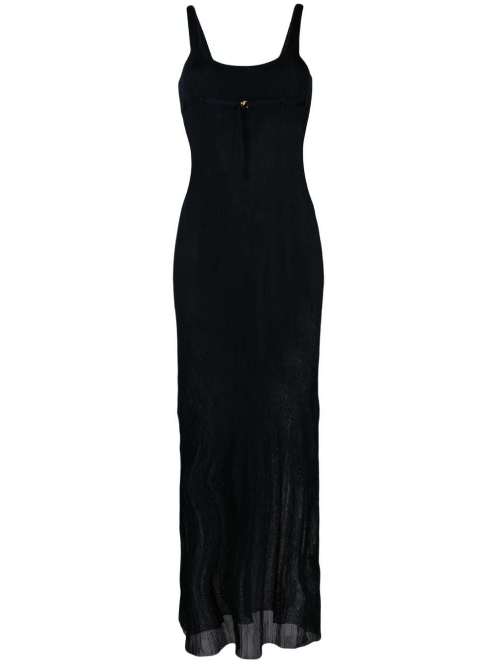 La Robe Maille Oranger dress Jacquemus puts a characteristically daring spin on knitwear with this maxi dress, crafting it from a sheer ribbed knit that juxtaposes the opaque bodice. It boasts an adjustable D-ring belt under the bust, a subtle finishing detail. Highlights - Navy blue - Recycled polyester blend - Ribbed knit - Sheer - Gold-tone hardware - Scoop neck - Thin shoulder straps - D-ring buckle belt - Floor-length - Straight hem Made in Italy Composition Recycled Polyester 78%, Polyester 14%, Polyamide 8% SIZE & FIT Model measurements Height 5 ft 9 in(1.76 m) Bust/Chest 31.88 in(81 cm) Hips 35.43 in(90 cm) Waist 24.8 in(63 cm) FittingInformation Designed for a close fit throughout Made with a midweight knit, this piece offers some stretch This piece fits true to size – take your usual size