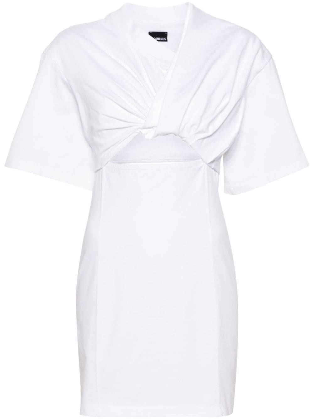 La Robe T-shirt Bahia minidress Classic shirt dresses are the inspiration behind Jacquemus’ La Robe Bahia minidress. This white cotton iteration is given a quintessentially playful twist with a cut-out at the front. Highlights - White - Cotton - Jersey texture - Seam detailing - Twist detailing - Cut-out detailing - V-neck - Short sleeves - Rear clasp fastening - Rear zip fastening - Above-knee length - Straight hem Imported Composition Cotton 100% SIZE & FIT Model measurements Height 5 ft 10 in(1.79 m) Bust/Chest 31.49 in(80 cm) Hips 35.03 in(89 cm) Waist 23.62 in(60 cm) Washing instructions Machine Wash