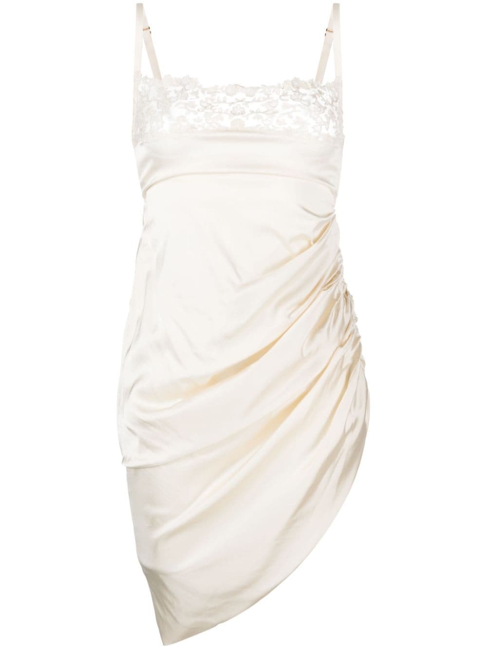 La Saudade asymmetric dress The La Saudade dress by Jacquemus, known for its distinct style, is elegantly accessorized with a floral embroidered tulle neckline. Its asymmetric design features a fluid cut with draping and gathering detailing from the hip. Highlights - Off-white - Cotton blend - Floral-lace detailing - Thin shoulder straps - Open back - Asymmetric design Made in Italy Composition Outer: Polyamide 100%, Viscose 96%, Spandex/Elastane 4% Lining: Cotton 48%, Acetate 47%, Spandex/Elastane 5% SIZE & FIT Model measurements Height 5 ft 9 in(1.76 m) Bust/Chest 31.88 in(81 cm) Hips 35.43 in(90 cm) Waist 24.8 in(63 cm) Measurement HIPS 34.64 in(88 cm) LENGTH 40.15 in(102 cm) WAIST 27.55 in(70 cm) FittingInformation Designed for a slim fit that sits just away from the body offering a close yet comfortable fit The adjustable shoulder straps allow for a preferred fit when worn Made from a midweight fabric This piece fits true to size – take your usual size Washing instructions Dry Clean Only