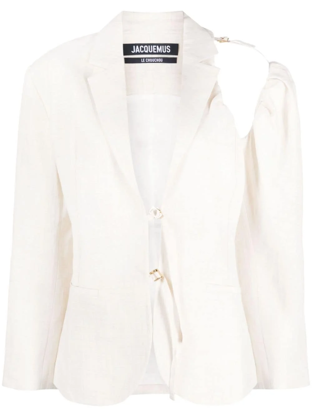 La veste Galliga asymmetric blazer Jacquemus offers a laidback take on the classic blazer. This linen-blend garment has one exposed shoulder with a puffed sleeve and adjustable attached strap, as well as metal D-ring fastenings in place of traditional buttons. Highlights - Off-white - Linen blend - Notched lapels - Cut-out detailing - Long sleeves - Adjustable attached strap - Gold-tone hardware - Adjustable d-ring fasteners - Two side welt pockets - Buttoned central rear vent Imported Composition Outer: Linen/Flax 60%, Viscose 26%, Polyester 14% Lining: Cotton 48%, Acetate 47%, Spandex/Elastane 5% SIZE & FIT Measurement SLEEVE LENGTH 22.99 in(58.4 cm) LENGTH 26.49 in(67.3 cm) WAIST 32 in(81.3 cm) BUST 34.01 in(86.4 cm) Washing instructions Dry Clean Only