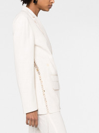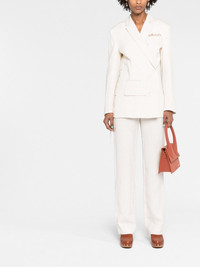 La Veste Tibau Brodee blazer In keeping with the brand’s artisanal focus for SS23, Jacquemus reimagines the classic double-breasted blazer. Crafted from a lightweight linen blend, it’s framed by lace-up detailing and an embroidered patch in place of a chest pocket. Highlights - Off-white - Linen blend - Embroidered design - Lace detailing - Notched lapels - Double-breasted button fastening - Long sleeves - Chest welt pocket - Front welt pocket - Front flap pocket Made in France Composition Outer: Linen/Flax 60%, Viscose 26%, Polyester 14% Lining: Acetate 48%, Cotton 46%, Spandex/Elastane 6% Washing instructions Dry Clean Only