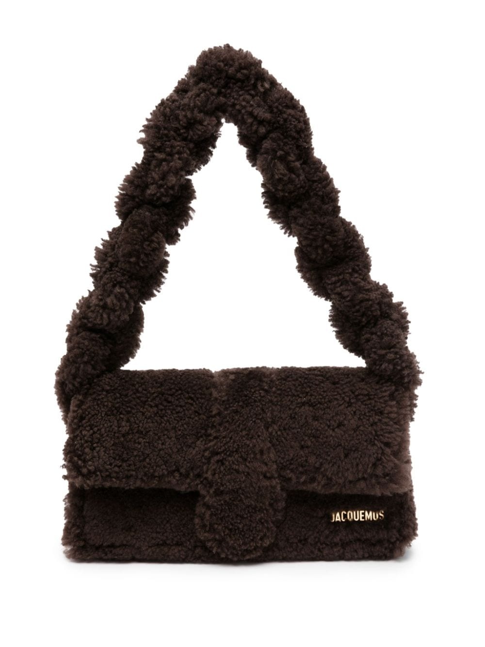 Le Bambidou shearling shoulder bag Jacquemus exhibits its experimental design approach on this brown Le Bambidou shoulder bag. Complemented with gold-tone logo lettering, its structured silhouette is enveloped in soft shearling and accentuated with a braided shoulder strap for a bold finish. Highlights - Brown - Shearling - Long top handle - Braid detailing - Gold-tone logo lettering - Foldover top with magnetic fastening - Main compartment - Internal card slot - Slip pocket to the rear - Gold-tone hardware Made in Italy Composition Lining: Cotton 100% Outer: Calf Leather 100%, Lamb Fur 100% SIZE & FIT Model measurements Height 5 ft 10 in(1.78 m) Bust/Chest 33.46 in(85 cm) Hips 36.22 in(92 cm) Waist 23.22 in(59 cm) Measurement DEPTH 3.14 in(8 cm) HANDLE 8.26 in(21 cm) HEIGHT 5.9 in(15 cm) WIDTH 11.41 in(29 cm)