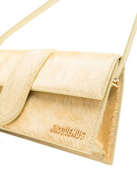 Le Bambino Long pony-hair shoulder bag Crafted in Italy from smooth calf leather, Jacquemus' Le Bambino tote bag is a cult classic thanks to its miniature shape, structured trapeze silhouette and gold-tone logo lettering accent. Highlights - Pale yellow - Calf leather - Pony hair - Gold-tone logo plaque - Trapeze body - Foldover top with magnetic fastening - Single top handle - Internal logo patch - Internal slip pocket - Main compartment - Canvas lining Made in Italy Composition Outer: Calf Leather 100% SIZE & FIT Model measurements Height 5 ft 10 in(1.78 m) Bust/Chest 32.67 in(83 cm) Hips 35.43 in(90 cm) Waist 23.22 in(59 cm) Measurement DEPTH 2.36 in(6 cm) HANDLE 20.07 in(51 cm) HEIGHT 5.11 in(13 cm) WIDTH 11.02 in(28 cm)