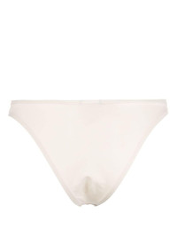 Le Bas de Maillot Signature bikini bottoms Jacquemus' signature minimalist style is showcased in an opulent way on the Le Bas de Maillot Signature bikini bottoms through a gold-tone logo-plaque detail at the side of the design, a recurrent plaque in the brand’s designs. Highlights - Milk white - Recycled polyester blend - Low-rise - Gold-tone logo plaque - Be mindful to try on swimwear over your own garments. Imported Composition Recycled Polyester 93%, Spandex/Elastane 7%