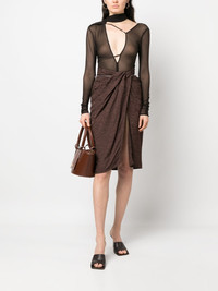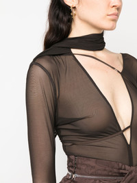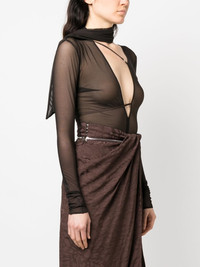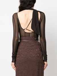 Le body Abanaba semi-sheer bodysuit The semi-sheer Abanaba bodysuit mirrors Jacquemus' bold aesthetic. It's crafted to an asymmetric silhouette with a plunging V-neck and slim crossover straps anchored by silver-tone chain-links and a split ring. Highlights - Chestnut brown - Asymmetric design - Seam detailing - Semi-sheer construction - Plunging v-neck - Pussy-bow collar - Long sleeves - Press-stud fastening - Just a reminder that this piece must be tried on over your own garments. Imported Composition Polyamide 93%, Spandex/Elastane 7% SIZE & FIT Model measurements Height 5 ft 10 in(1.78 m) Bust/Chest 31.49 in(80 cm) Hips 36.22 in(92 cm) Waist 25.59 in(65 cm) FittingInformation Designed for a close fit throughout Made from a lightweight stretch fabric, this piece offers elasticity and flexibility when worn This piece fits true to size – take your usual size Washing instructions Hand Wash
