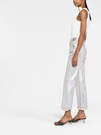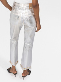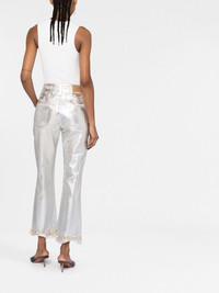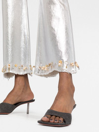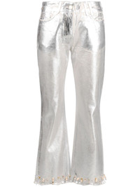 Le de Nimes Court Artichaut jeans Crafted in Portugal, these jeans by Jacquemus lean into the brand's playful side with their metallic finish and bead-embellished fringed hems. Branded details include the signature J-shaped belt loop and logo back patch. Highlights - Silver - Organic cotton - Denim - Metallic finish - Mid-rise - Belt loops - 'j' loop - Button fly fastening - Straight leg - Frayed hem - Bead detailing - Logo patch to the rear Imported Composition Organic Cotton 100% SIZE & FIT Model measurements Height 5 ft 11 in(1.8 m) Bust/Chest 31.49 in(80 cm) Hips 35.82 in(91 cm) Waist 24.8 in(63 cm) FittingInformation Designed with a flared hem, these trousers allow for a close fit at the waist with a slim fit over the leg and widening towards the hem Cropped in length Sturdy and hard-wearing, this denim piece offers no stretch This piece fits true to size – take your usual size