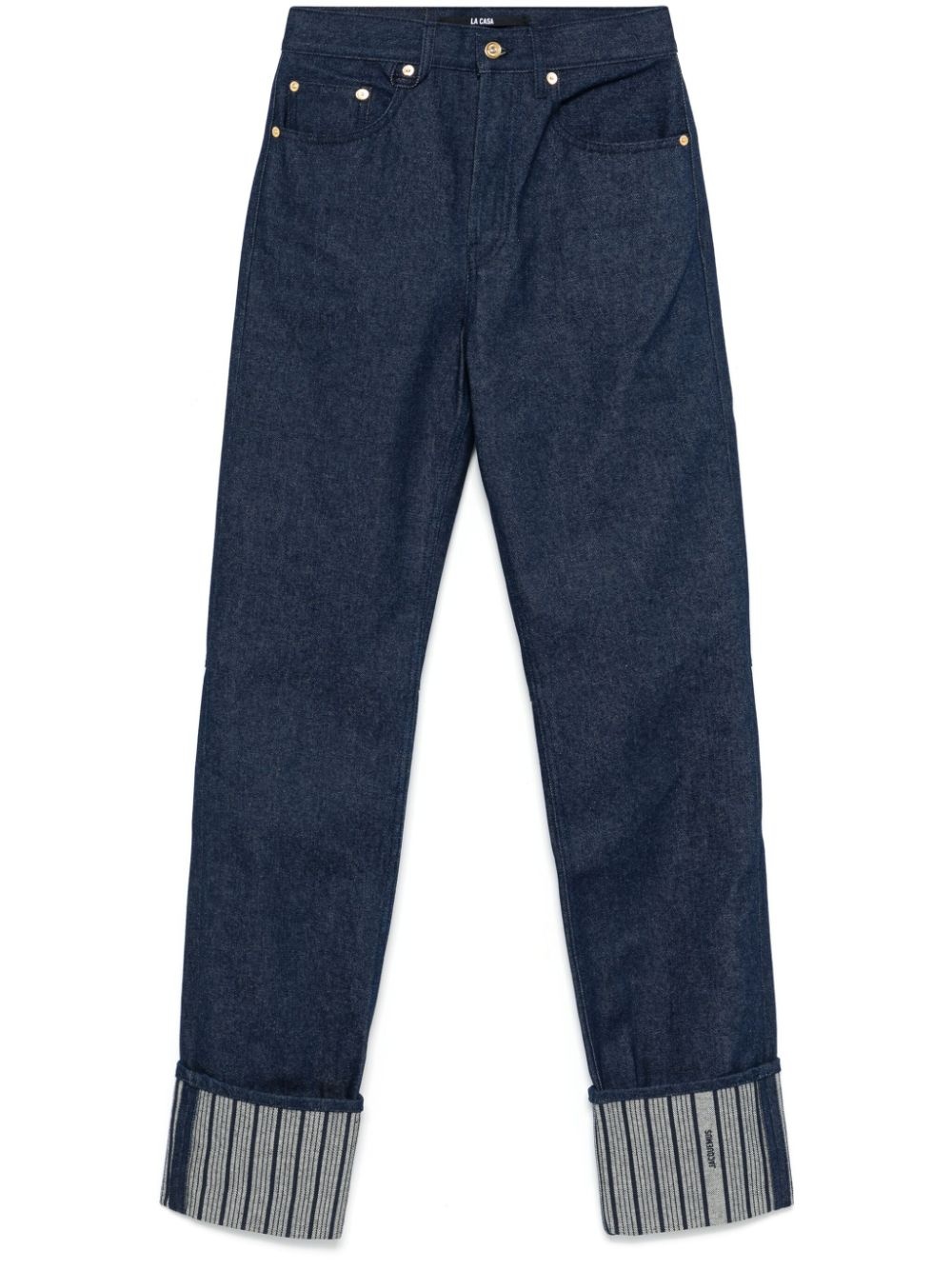 Le De-Nimes jeans Highlights - Blue - Cotton - Denim - Dark wash - Button fly fastening - Belt loops - Classic five pockets - Logo patch to the rear - Turn-up hem - Straight leg Imported Composition Cotton 100% SIZE & FIT Model measurements Height 5 ft 9 in(1.75 m) Bust/Chest 31.88 in(81 cm) Hips 34.64 in(88 cm) Waist 24.01 in(61 cm) FittingInformation Designed with a wide leg cut, these jeans allow for a close fit at the waist and offer a loose and roomy fit over the leg Sturdy and hard-wearing, this denim piece offers no stretch