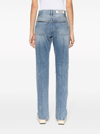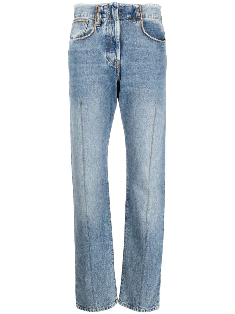 Le de Nimes Linon straight-leg jeans Cut from cotton to a straight silhouette, Jacquemus' stonewashed jeans are stitched with a grosgrain logo ribbon on the back and are finished with frayed edges. Highlights - Light blue - Cotton - Washed denim - Contrast stitching - Frayed detailing - Logo patch to the rear - Mid-rise - Belt loops - Concealed front fastening - Classic five pockets - Straight leg Made in Italy Composition Regenerative Cotton 100% SIZE & FIT Model measurements Height 5 ft 10 in(1.79 m) Bust/Chest 33.07 in(84 cm) Hips 35.82 in(91 cm) Waist 24.01 in(61 cm) FittingInformation Designed for a straight-leg fit, these jeans allow for a close fit at the waist and an unrestricted and comfortable fit over the leg Sturdy and hard-wearing, this denim piece offers no stretch This piece fits true to size – take your usual size Washing instructions Machine Wash