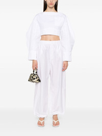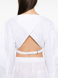 Le Haut blouse Highlights - White - Cotton - Boat neck - Rear buckle-strap fastening - Drop shoulder - Long sleeves with buttoned cuffs - Open back - Cropped straight hem Imported Composition Cotton 100% SIZE & FIT Model measurements Height 5 ft 10 in(1.78 m) Bust/Chest 33.85 in(86 cm) Hips 36.61 in(93 cm) Waist 26.77 in(68 cm) FittingInformation Designed for a slim fit that sits just away from the body offering a close yet comfortable fit The belt offers adjustability for fitted preferences Made from a midweight non-stretch fabric This piece fits true to size – take your usual size