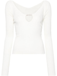 Le Haut Pralu ribbed top Highlights - Off-white - Ribbed knit - Gold-tone logo lettering - Cut-out detailing - Scallop edge - V-neck - Long sleeves - Ribbed cuffs and hem Imported Composition Viscose 94%, Polyester 6% SIZE & FIT Model measurements Height 5 ft 10 in(1.78 m) Bust/Chest 31.49 in(80 cm) Hips 35.03 in(89 cm) Waist 23.62 in(60 cm)