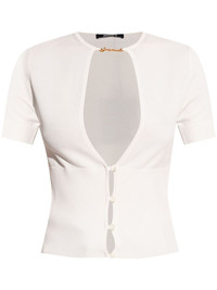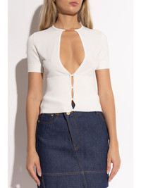 Le Haut Pralu top Highlights - White - Fine knit - Front button fastening - Gold-tone logo plaque - Crew neck - Keyhole neck - Short sleeves - Cropped - Straight hem Imported Composition Viscose 94%, Polyester 6% SIZE & FIT FittingInformation Designed for a slim fit that sits just away from the body offering a close yet comfortable fit Made with a midweight knit, this piece offers some stretch Washing instructions Read Manufacturer Guidelines