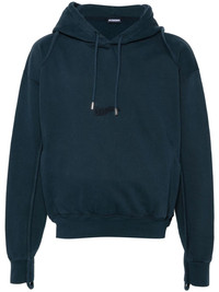 Le Sweatshirt Camargue cotton top Jacquemus’ hoodie is characterised by the waved logo embroidery at the chest: it’s rendered in a tonal navy hue. The design is cut from organic cotton to a classic silhouette tapered with ribbed trims. Highlights - Navy blue - Organic cotton - Jersey texture - Seam detailing - Embroidered wave logo at the chest - Engraved logo at the zip - Drawstring hood - Drop shoulder - Long sleeves - Thumb slot - Slip pockets to the sides - Ribbed cuffs and hem Imported Composition Organic Cotton 100% SIZE & FIT Model measurements Height 6 ft 2 in(1.87 m) Bust/Chest 36.22 in(92 cm) Hips 37 in(94 cm) Waist 27.95 in(71 cm) FittingInformation Designed for a relaxed fit, this piece allows for comfort and movement when worn The ribbed hem offers a close, comfortable fit Made from a midweight non-stretch fabric, this piece offers minimal elasticity when worn This piece fits true to size – take your usual size