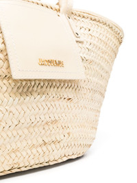 Le Panier Soli raffia tote bag Handwoven in Morroco, the Le Panier Soli tote bag by Jacquemus features a spacious silhouette adorned with multiple leather handles for enhanced versatility. Opulent gold-tone logo lettering adorns the front of the timeless summer accessory. Highlights - Beige - Raffia - Leather trim - Two flat shoulder straps - Two rolled top handles - Gold-tone logo lettering - Open top - Lobster claw fastening - Main compartment - Gold-tone hardware Made in France Composition Outer: Calf Leather 100%, Straw 100% SIZE & FIT Model measurements Height 5 ft 10 in(1.78 m) Bust/Chest 30.7 in(78 cm) Hips 36.22 in(92 cm) Waist 25.59 in(65 cm) Measurement DEPTH 5.51 in(14 cm) HANDLE 5.11 in(13 cm) HEIGHT 11.61 in(29.5 cm) WIDTH 22.44 in(57 cm)