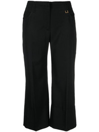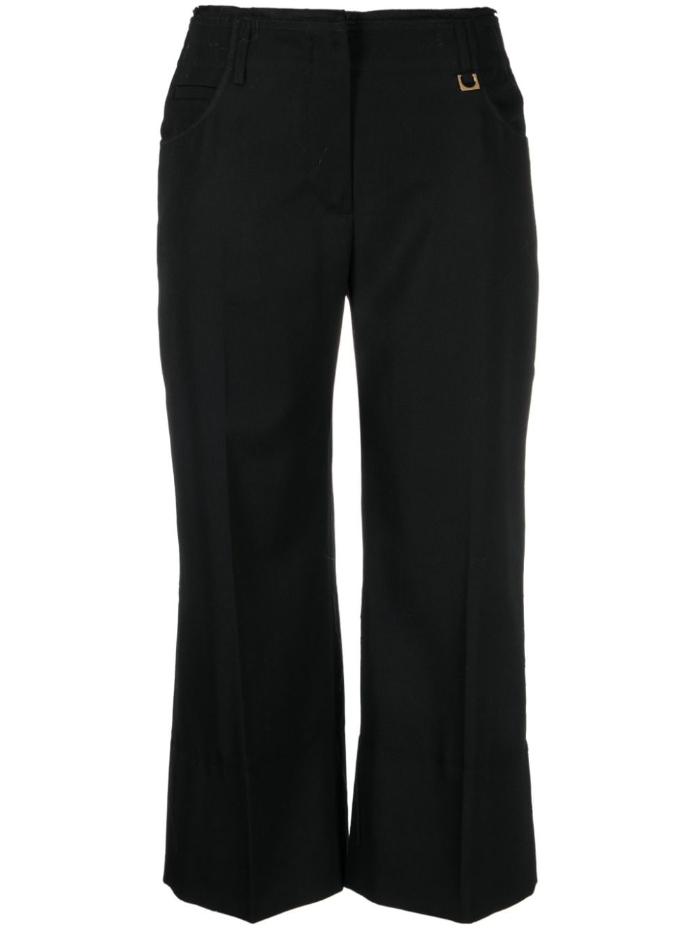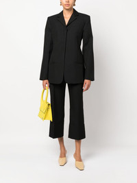 Le Pantalon cropped trousers Jacquemus merges a tailored-inspired silhouette with characteristic unexpected details in the design of these cropped trousers. They’re decorated with a metallic D-Ring on the belt loop. Highlights - Black - Virgin wool - Pressed crease - D-ring findings - Mid-rise - Concealed front fastening - Two side inset pockets - Cropped leg Imported Composition Lining: Cotton 97%, Elastane 3% Outer: Virgin Wool 100% SIZE & FIT Model measurements Height 5 ft 9 in(1.76 m) Bust/Chest 31.88 in(81 cm) Hips 35.43 in(90 cm) Waist 24.8 in(63 cm) FittingInformation Designed for a straight-leg fit, these trousers allow for a close fit at the waist and an unrestricted, comfortable fit over the leg Cropped in length Made from a midweight non-stretch fabric This piece fits true to size – take your usual size Washing instructions Dry Clean Only
