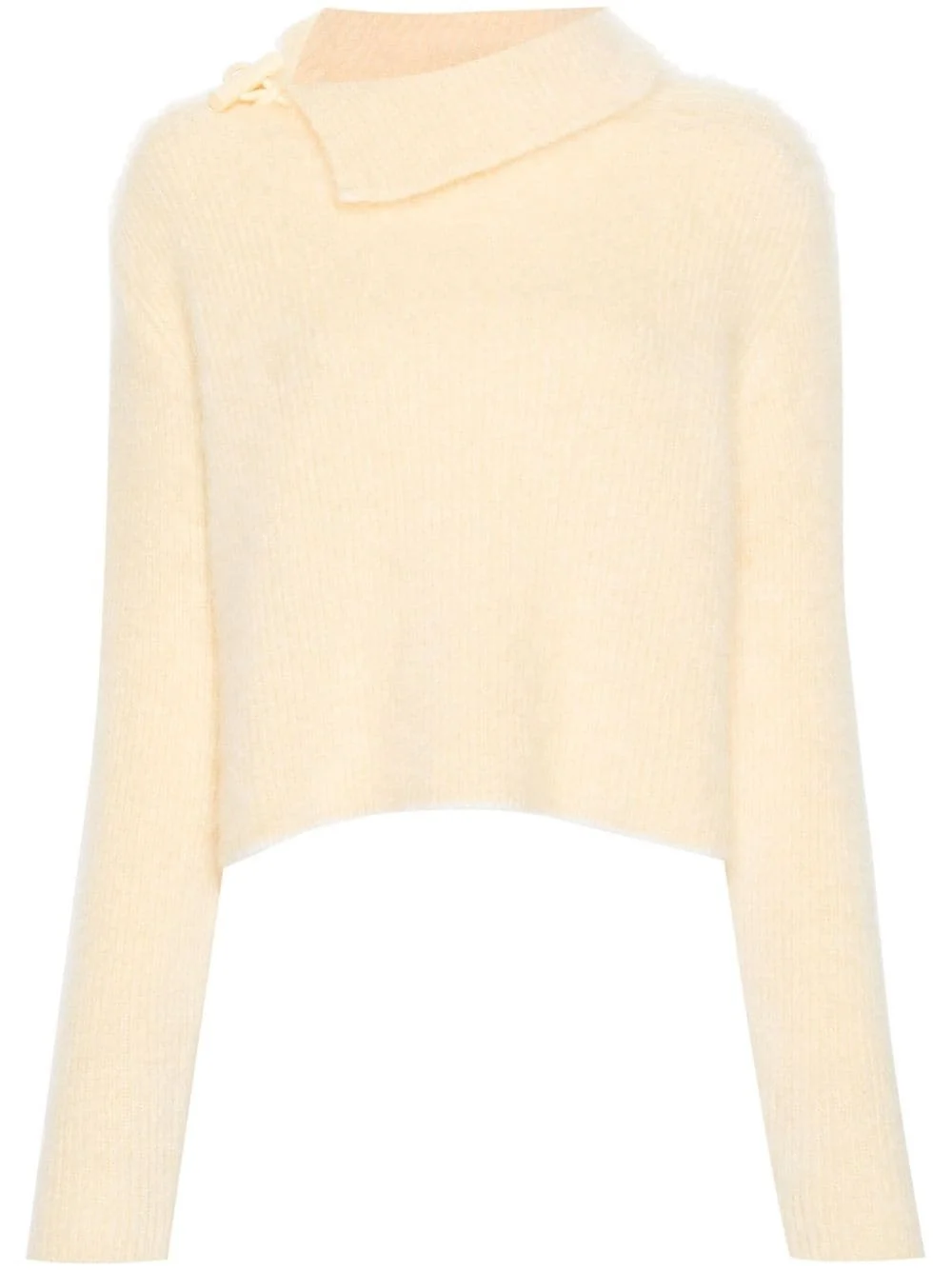 Le Pull Marina sweater Highlights - Light yellow - Ribbed knit - Brushed effect - Asymmetric neck - Toggle fastening - Long sleeves - Logo patch to the rear - Unlined - Straight hem Made in Italy Composition Mohair 48%, Polyamide 35%, Merino 17% SIZE & FIT Model measurements Height 5 ft 9 in(1.75 m) Bust/Chest 34.64 in(88 cm) Hips 36.61 in(93 cm) Waist 26.37 in(67 cm) FittingInformation Designed for a relaxed fit, this piece allows for comfort and movement when worn Made with a midweight knit, this piece offers some stretch