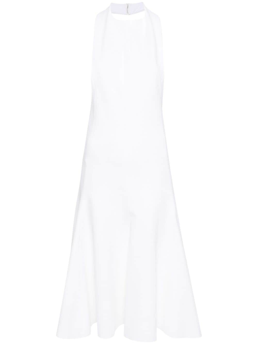 La Robe Favola dress Highlights - White - Stretch-design - Crepe texture - Halterneck - Crew neck - Sleeveless - Flared skirt - Open back - Partial lining - Below-knee length - Straight hem - Concealed rear hook and zip fastening Imported Composition Outer: Viscose 78%, Polyamide 16%, Elastane 6% Lining: Polyamide 78%, Elastane 22% SIZE & FIT Model measurements Height 5 ft 10 in(1.77 m) Bust/Chest 32.28 in(82 cm) Hips 35.03 in(89 cm) Waist 25.19 in(64 cm) FittingInformation Made from a midweight stretch fabric, this piece offers elasticity and flexibility when worn This piece fits large – take one size down