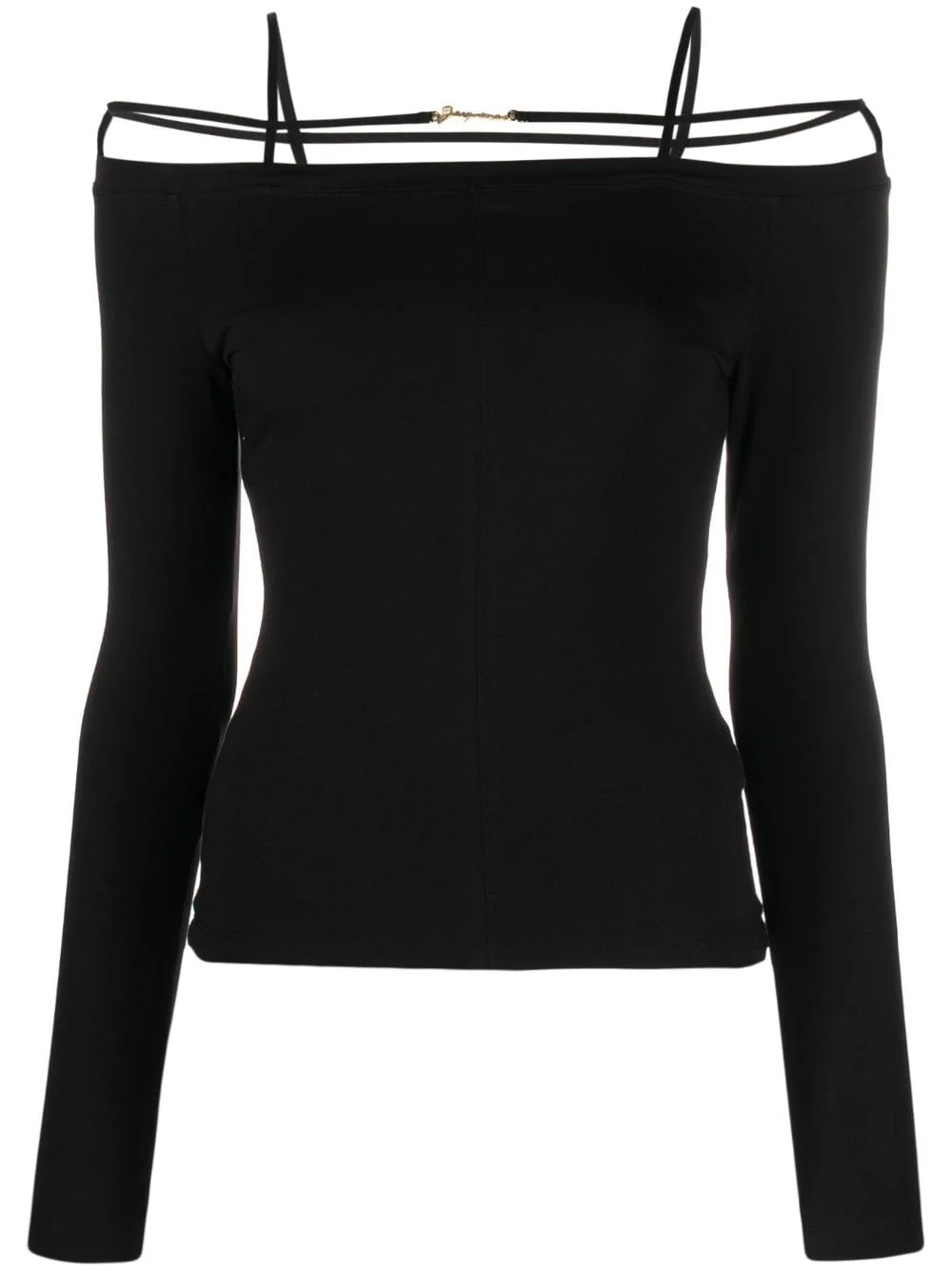 Le T-shirt Sierra cotton top Crafted from stretch cotton, this long-sleeve top from Jacquemus showcases the brand's playful approach. It's cut to an off-shoulder silhouette accentuated by slender shoulder straps and signature logo hardware at the chest. Highlights - Black - Stretch-cotton - Spaghetti straps - Strap detailing - Gold-tone logo plaque - Off-shoulder - Long sleeves - Straight hem Imported Composition Outer: Cotton 94%, Elastane 6% SIZE & FIT Model measurements Height 5 ft 9 in(1.75 m) Bust/Chest 31.49 in(80 cm) Hips 34.05 in(86.5 cm) Waist 24.21 in(61.5 cm) Measurement BUST 26.77 in(68 cm) LENGTH 15.74 in(40 cm) SLEEVE LENGTH 18.11 in(46 cm) FittingInformation Designed for a close fit throughout Made from a lightweight stretch fabric, this piece offers elasticity and flexibility when worn This piece fits true to size – take your usual size
