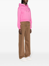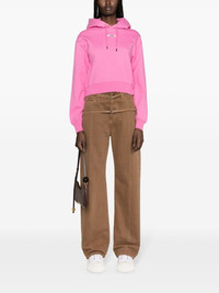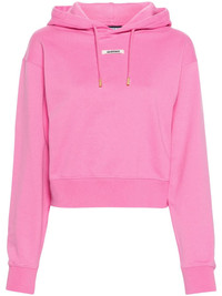 Le Hoodie Gros Grain cotton top Crafted from soft cotton jersey, Jacquemus' Gros Grain hoodie gets its name from the logo-printed grosgrain tab that adorns the chest. Highlights - Bubblegum pink - Cotton - Jersey texture - Logo patch to the front - Drawstring hood - Logo-engraved gold-tone hardware - Long sleeves - Ribbed cuffs and hem - Cropped - Fleece lining Imported Composition Cotton 100% Washing instructions Machine Wash