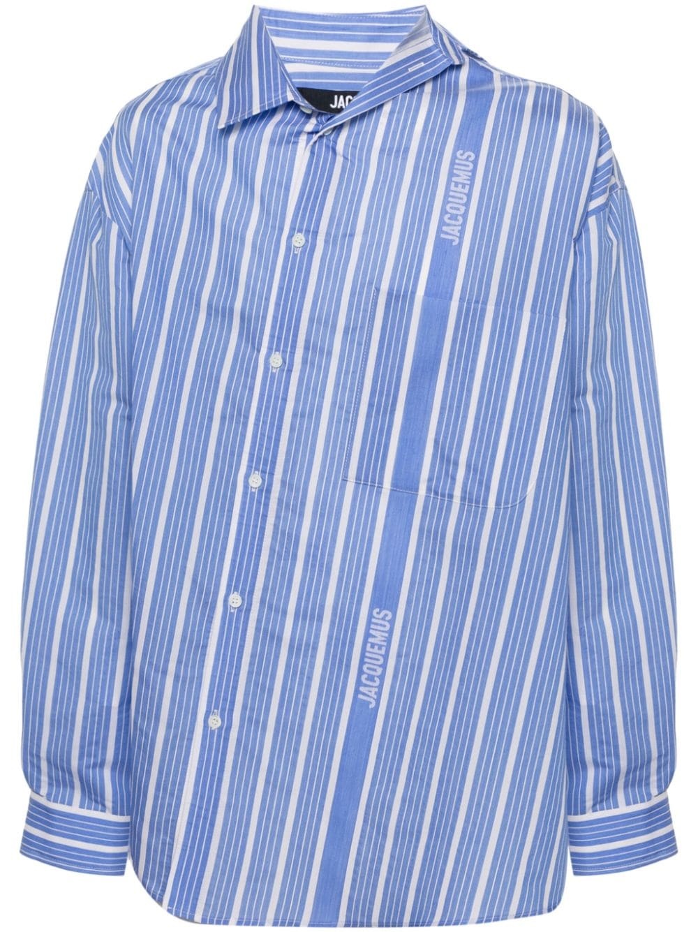 logo-striped shirt Highlights - Blue/white - Silk virgin-wool blend - Vertical stripe print - Spread collar - Drop shoulder - Long sleeves - Buttoned cuffs - Chest patch pocket - Internal logo tag - Curved hem - Diagonal front button fastening Imported Composition Silk 53%, Virgin Wool 35%, Polyamide 12% SIZE & FIT Model measurements Height 6 ft 0 in(1.84 m) Bust/Chest 35.82 in(91 cm) Hips 37 in(94 cm) Waist 28.34 in(72 cm) FittingInformation Designed to be unstructured, offering a loose fit throughout Made from a midweight non-stretch fabric This piece fits true to size – those with broad shoulders may wish to take one size up
