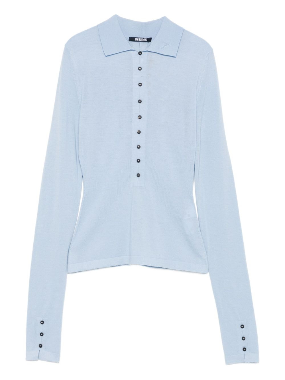 merino-wool polo shirt Highlights - Light blue - Button fastening - Polo collar - Long sleeves - Buttoned cuffs - Embroidered detail Imported Composition Merino 100% SIZE & FIT Model measurements Height 5 ft 9 in(1.75 m) Bust/Chest 32.67 in(83 cm) Hips 36.22 in(92 cm) Waist 24.8 in(63 cm) Washing instructions Read Manufacturer Guidelines
