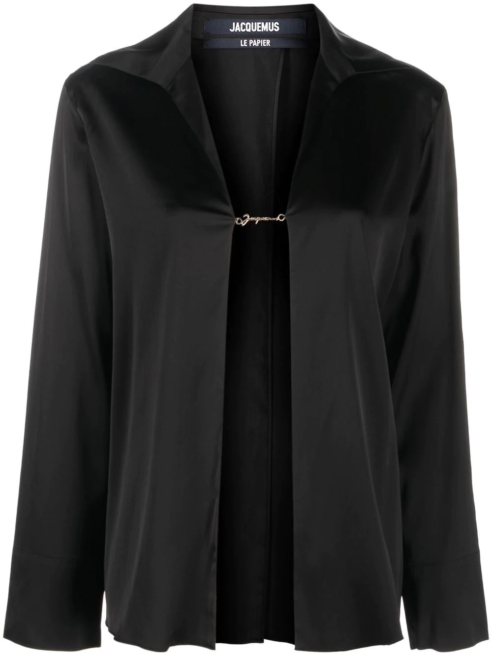 La Chemise Notte satin shirt Jacquemus is synonymous with innovative, minimalist design. Showcased on this iconic long-sleeve shirt from the brand's SS22 collection, the garment features a logo plaque at the front and is constructed from tonal, satin-finish material. Highlights - Black - Stretch-cotton - V-neck - Logo plaque - Long sleeves Imported Composition Viscose 96%, Elastane 4% SIZE & FIT Model measurements Height 5 ft 10 in(1.78 m) Bust/Chest 29.92 in(76 cm) Hips 34.64 in(88 cm) Waist 23.62 in(60 cm) Measurement LENGTH 26.37 in(67 cm) FittingInformation This piece fits true to size. We recommend you get your regular size Cut for a loose fit Made with a mid-weight stretch fabric Washing instructions Dry Clean Only