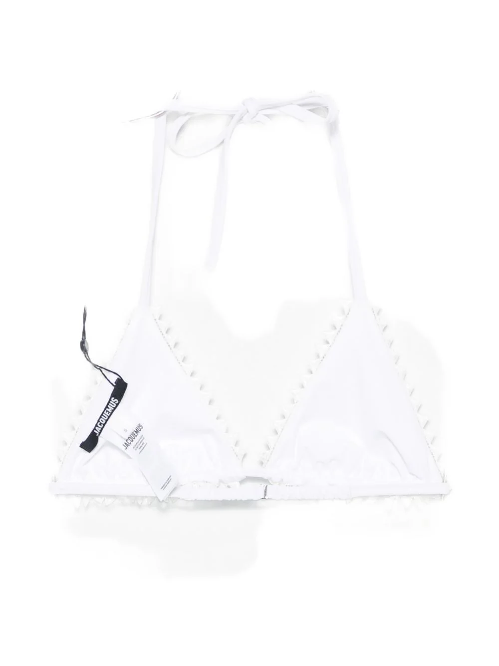 ruffled triangle bikini top Highlights - White - Triangle cups - Ruffled trim - Self-tie fastening Imported Composition Polyamide 59%, Elastane 41% Washing instructions Machine Wash