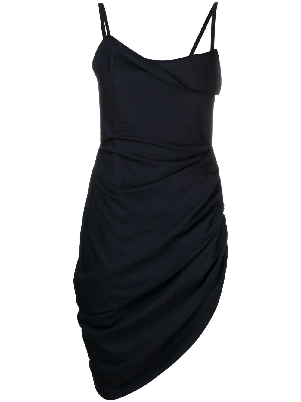 La Robe Saudade draped minidress Highlights - Dark navy blue - Stretch-design - Asymmetric design - Folded edge at the chest - Ruched detailing - Draped detailing - Square open back - Square neck - Concealed side zip fastening - Adjustable spaghetti straps - Sleeveless - Thigh-length - Asymmetric hem - Unlined Imported Composition Outer: Viscose 88%, Polyamide 12% Lining: Cotton 97%, Spandex/Elastane 3% SIZE & FIT Model measurements Height 5 ft 11 in(1.8 m) Bust/Chest 31.49 in(80 cm) Hips 35.82 in(91 cm) Waist 24.8 in(63 cm) FittingInformation Designed for a slim fit that sits just away from the body offering a close yet comfortable fit The adjustable shoulder straps allow for a preferred fit when worn Made from a midweight fabric This piece fits true to size – take your usual size Washing instructions Dry Clean Only