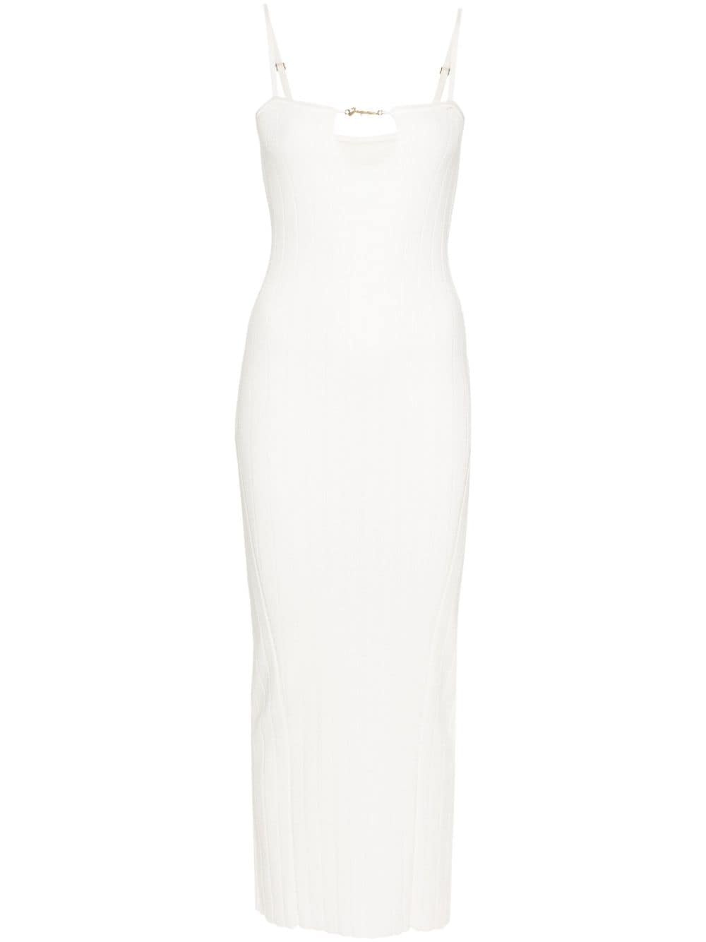 Sierra ribbed midi dress This ribbed knit midi dress by Jacquemus offers an elegant silhouette. It's designed with a square neckline and keyhole detail, elevated with the label's signature gold-tone logo plaque. Adjustable spaghetti straps allow for the perfect fit. Highlights - Off-white - Ribbed knit - Gold-tone logo plaque - Keyhole neck - Adjustable spaghetti straps - Bodycon design - Straight hem - Unlined Made in Italy Composition Viscose 88%, Polyester 12% SIZE & FIT Model measurements Height 5 ft 10 in(1.78 m) Bust/Chest 33.07 in(84 cm) Hips 36.61 in(93 cm) Waist 24.8 in(63 cm) Measurement HIPS 30.7 in(78 cm) LENGTH 50.78 in(129 cm) WAIST 24.8 in(63 cm) FittingInformation Designed for a slim fit that sits just away from the body offering a close yet comfortable fit Made with a midweight knit, this piece offers some stretch This piece fits true to size – take your usual size