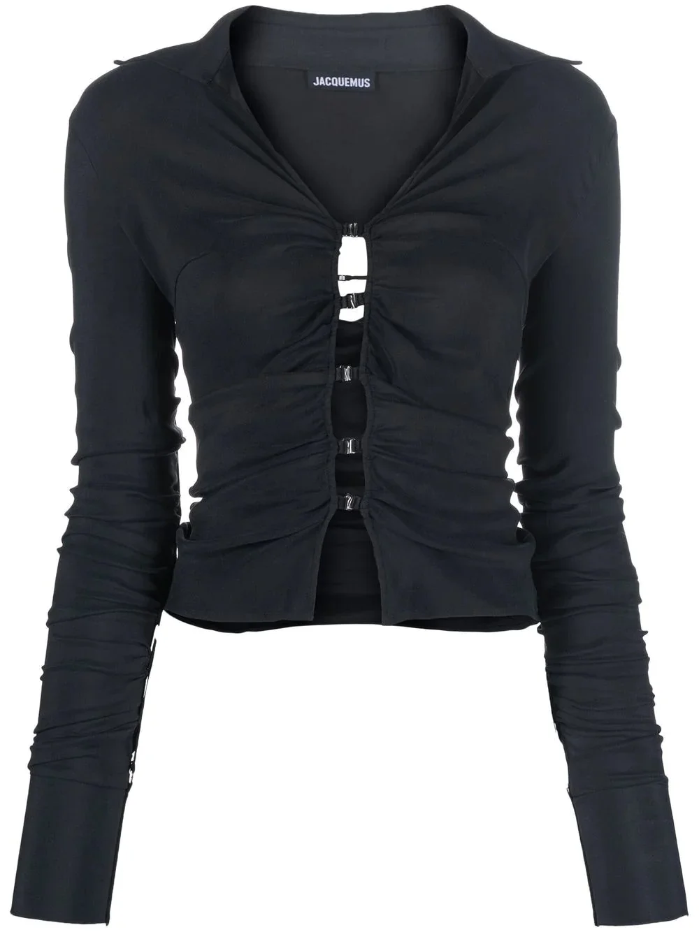 Soffio cut-out shirt Made from a delicate blend of silk, this navy iteration of the Soffio shirt reflects Jacquemus' whimsical yet relaxed approach to garments for AW22. Gathered at the front and creating cut-out accents, this long-sleeve top is elevated with a statement-pointed collar. Imported Composition Viscose 75%, Silk 21%, Spandex/Elastane 4% SIZE & FIT Model measurements Height 5 ft 10 in(1.78 m) Bust/Chest 31.49 in(80 cm) Hips 35.43 in(90 cm) Waist 24.4 in(62 cm) FittingInformation This piece fits true to size. We recommend you get your regular size Cut for a slim fit Made with a mid-weight stretch fabric Washing instructions Dry Clean Only