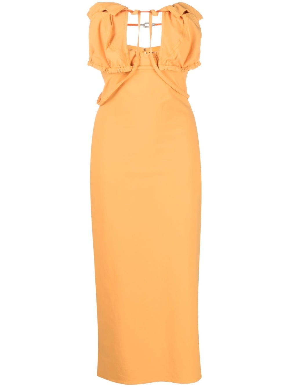 strap-detail sleeveless dress Jacquemus' distinctive minimalist design style is showcased on this strapless dress from the SS23 collection through purposeful details such as cut-out detailing and strap detailing, to create an effortlessly sophisticated, contemporary garment. Highlights - Orange - Strapless - Cut-out detailing - Strap detailing Imported Composition Polyamide 55%, Cotton 36%, Spandex/Elastane 9% SIZE & FIT Model measurements Height 5 ft 10 in(1.79 m) Bust/Chest 31.1 in(79 cm) Hips 35.03 in(89 cm) Waist 24.01 in(61 cm) Measurement LENGTH 48.81 in(124 cm) WAIST 24.4 in(62 cm) HIPS 33.07 in(84 cm) FittingInformation Designed for a slim fit that sits just away from the body offering a close yet comfortable fit Made from a midweight stretch fabric, this piece offers elasticity and flexibility when worn This piece fits true to size – take your usual size Washing instructions Dry Clean Only