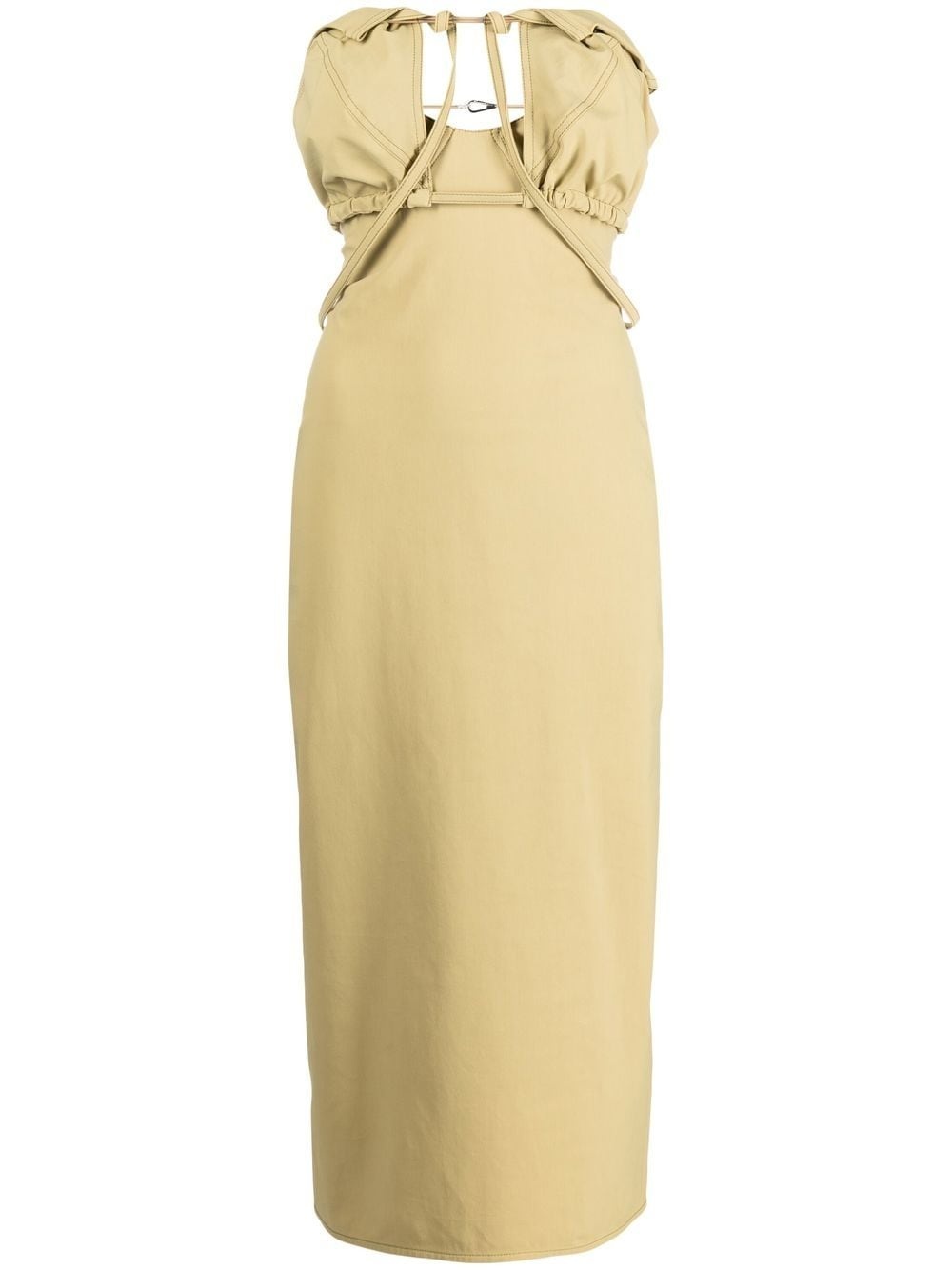strapless cut-out dress Highlights - Light khaki - Cotton blend - Strapless - Cut-out detailing - Ruched detailing Imported Composition Polyamide 55%, Cotton 36%, Elastane 9% SIZE & FIT Model measurements Height 5 ft 10 in(1.79 m) Bust/Chest 31.1 in(79 cm) Hips 35.03 in(89 cm) Waist 24.01 in(61 cm) Measurement LENGTH 48.81 in(124 cm) WAIST 26.77 in(68 cm) HIPS 36.22 in(92 cm) FittingInformation This piece fits true to size. We recommend you get your regular size Designed for a close fit at the bust, waist and hips Made with a mid-weight stretch fabric Washing instructions Dry Clean Only