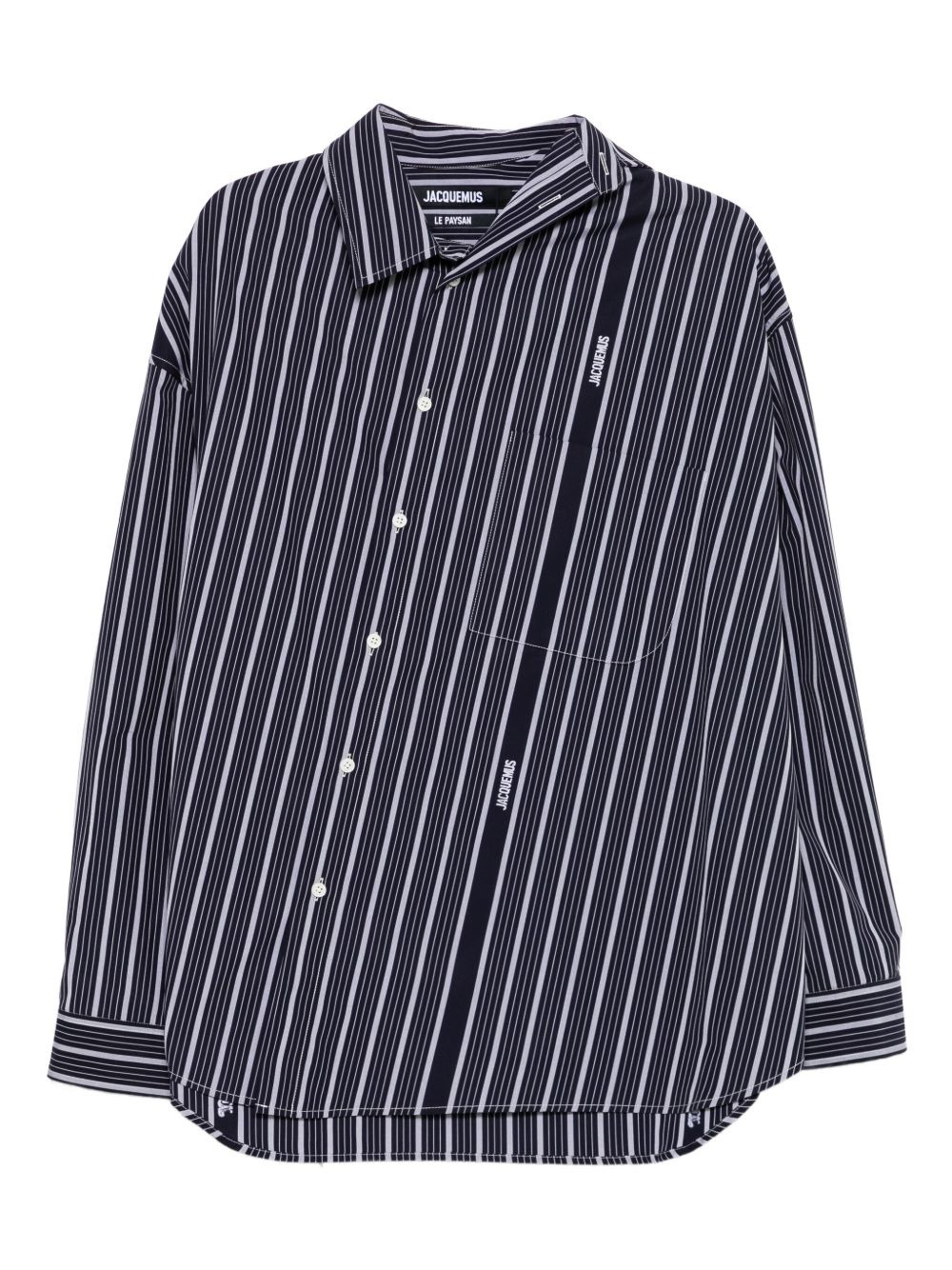 stripe logo shirt Highlights - Navy blue - Vertical stripes - Logo stripe - Long sleeves - Front button fastening - Chest patch pocket Imported Composition Cotton 100% SIZE & FIT Model measurements Height 6 ft 2 in(1.87 m) Bust/Chest 36.41 in(92.5 cm) Hips 37 in(94 cm) Waist 29.52 in(75 cm) Washing instructions Hand Wash