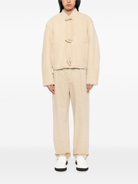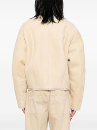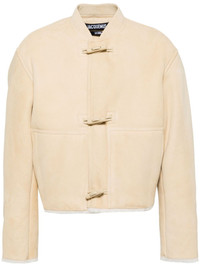Telo jacket Highlights - Light beige - Sheepskin - Suede - Front toggle fastening - Baseball collar - Two front patch pockets - Long sleeves - Cropped - Straight hem - Shearling lining Made in France Composition Sheepskin 100% SIZE & FIT Model measurements Height 6 ft 2 in(1.88 m) Bust/Chest 34.25 in(87 cm) Hips 34.64 in(88 cm) Waist 26.77 in(68 cm) FittingInformation Designed for a boxy fit, intended for a loose fit throughout Firm shearling has a treated construction offering some durability