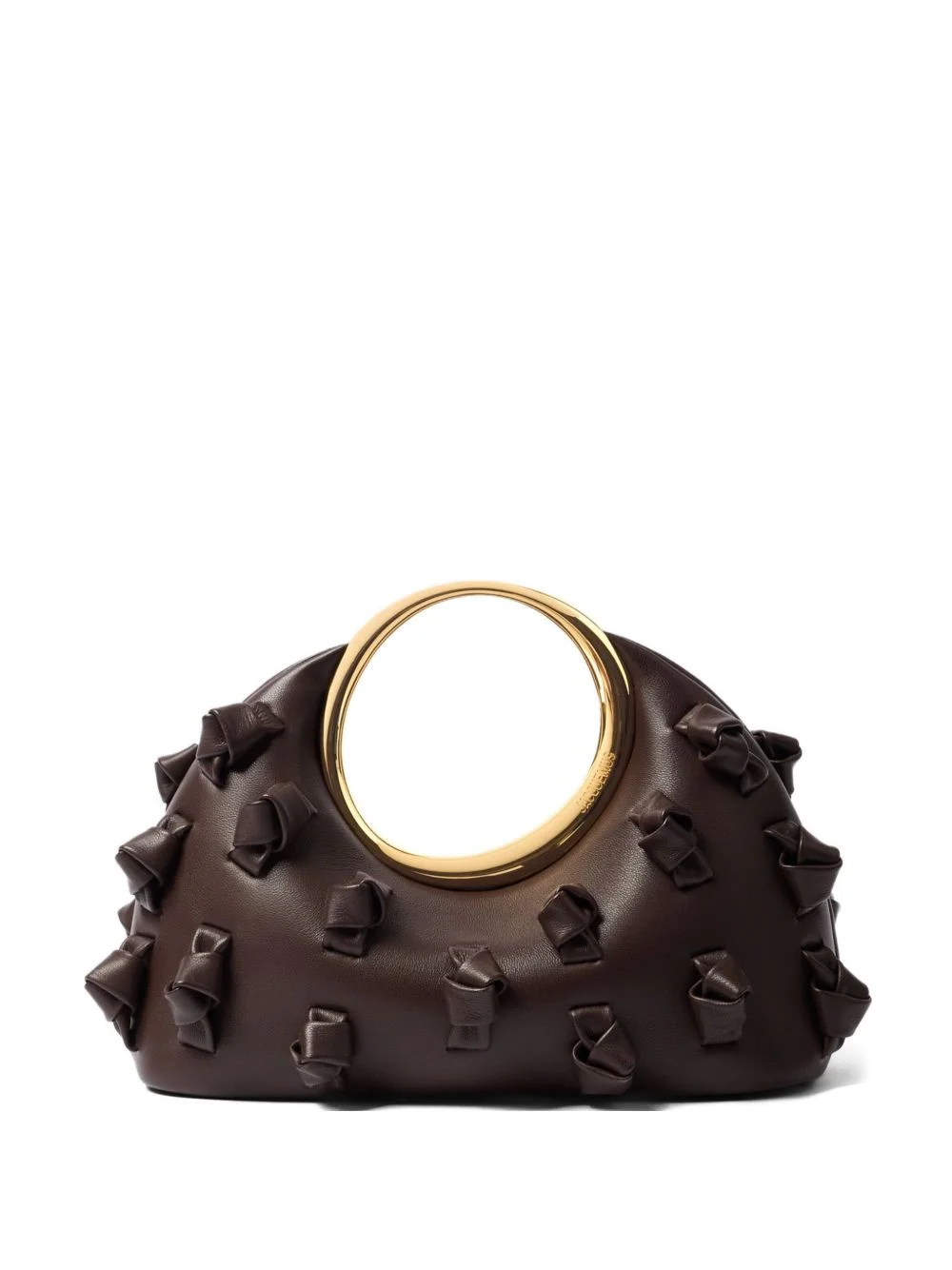 The small Calino with knots mini bag Highlights - Midnight brown - Knot detail - Top handle - Gold-tone hardware Made in Italy Composition Calf Leather 100% SIZE & FIT Measurement HEIGHT 6.49 in(16.5 cm) WIDTH 8.85 in(22.5 cm) DEPTH 3.34 in(8.5 cm)