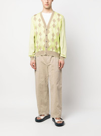 Toledo argyle cardigan Jacquemus introduces 'Le cardigan Toledo' as part of its SS23 collection. Defined by an argyle print that originated from Scotland, the cardigan features semi-sheer panels to the front, revealing the brand's penchant for merging traditional and contemporary styles. Highlights - Lime green/light brown - Cotton blend - Semi-sheer panels - Argyle check pattern - V-neck - Mother-of-pearl buttons - Long sleeves - Ribbed trim - Straight hem Made in Italy Composition Cotton 70%, Polyamide 30% SIZE & FIT Model measurements Height 6 ft 1 in(1.86 m) Bust/Chest 37.4 in(95 cm) Hips 34.64 in(88 cm) Waist 29.13 in(74 cm) Measurement CHEST 48.81 in(124 cm) SLEEVE LENGTH 25.19 in(64 cm) LENGTH 25.19 in(64 cm) FittingInformation Designed for a relaxed fit, this piece allows for comfort and movement when worn The ribbed hem offers a close, comfortable fit Made with a lightweight knit, this piece offers some stretch This piece fits true to size – take your usual size Washing instructions Hand Wash