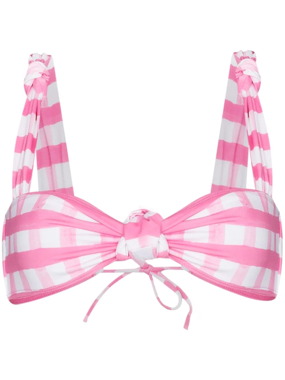 Vichy check bikini top Known for its French countryside-inspired aesthetic, Jacquemus extends the timeless gingham print to swimwear for SS22. In a pink and white colourway, the Vichy bikini top is crafted from a stretch blend of recycled polyester and adorned with a knot detail to the front. Highlights - Pink/white - Stretch-recycled polyester - Check print - Knot detailing - Rear tie fastening - Wide shoulder straps - Be mindful to try on swimwear over your own garments. Imported Composition Recycled Polyester 78%, Spandex/Elastane 22% SIZE & FIT Model measurements Height 5 ft 9 in(1.76 m) Bust/Chest 33.46 in(85 cm) Hips 37.79 in(96 cm) Waist 25.59 in(65 cm) FittingInformation This piece fits true to size. We recommend you get your regular size Made with a mid-weight stretch fabric Washing instructions Hand Wash