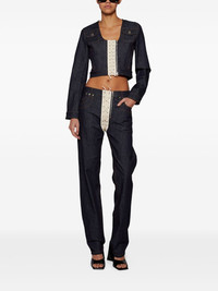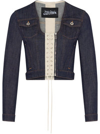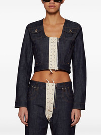cropped denim jacket Highlights - Dark blue - Classic denim style - Front lace-up detail - Buttoned chest pockets - Long sleeves - Cropped length - Single zip fastening - Stitched detailing - Contrasting panel Imported Composition Fabric 100%