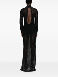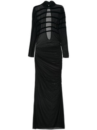 draped mesh dress Highlights - Black - Stretch-design - Mesh design - Semi-sheer construction - Flocked stripe pattern - High neck - Long sleeves with flocked logo - Ruched detailing - Floor-length - Keyhole detail to the rear - Straight hem - Unlined - Rear hook fastening Imported Composition Polyamide 94%, Elastane 6% SIZE & FIT Model measurements Height 5 ft 10 in(1.77 m) Bust/Chest 32.28 in(82 cm) Hips 35.03 in(89 cm) Waist 25.19 in(64 cm) Measurement SLEEVE LENGTH 25 in(63.5 cm) HIPS 27.99 in(71.1 cm) LENGTH 65 in(165.1 cm) WAIST 22 in(55.9 cm) BUST 27.99 in(71.1 cm) FittingInformation Designed for a slim fit that sits just away from the body offering a close yet comfortable fit Made from a lightweight stretch fabric, this piece offers elasticity and flexibility when worn This piece fits true to size – take your usual size Washing instructions Machine Wash