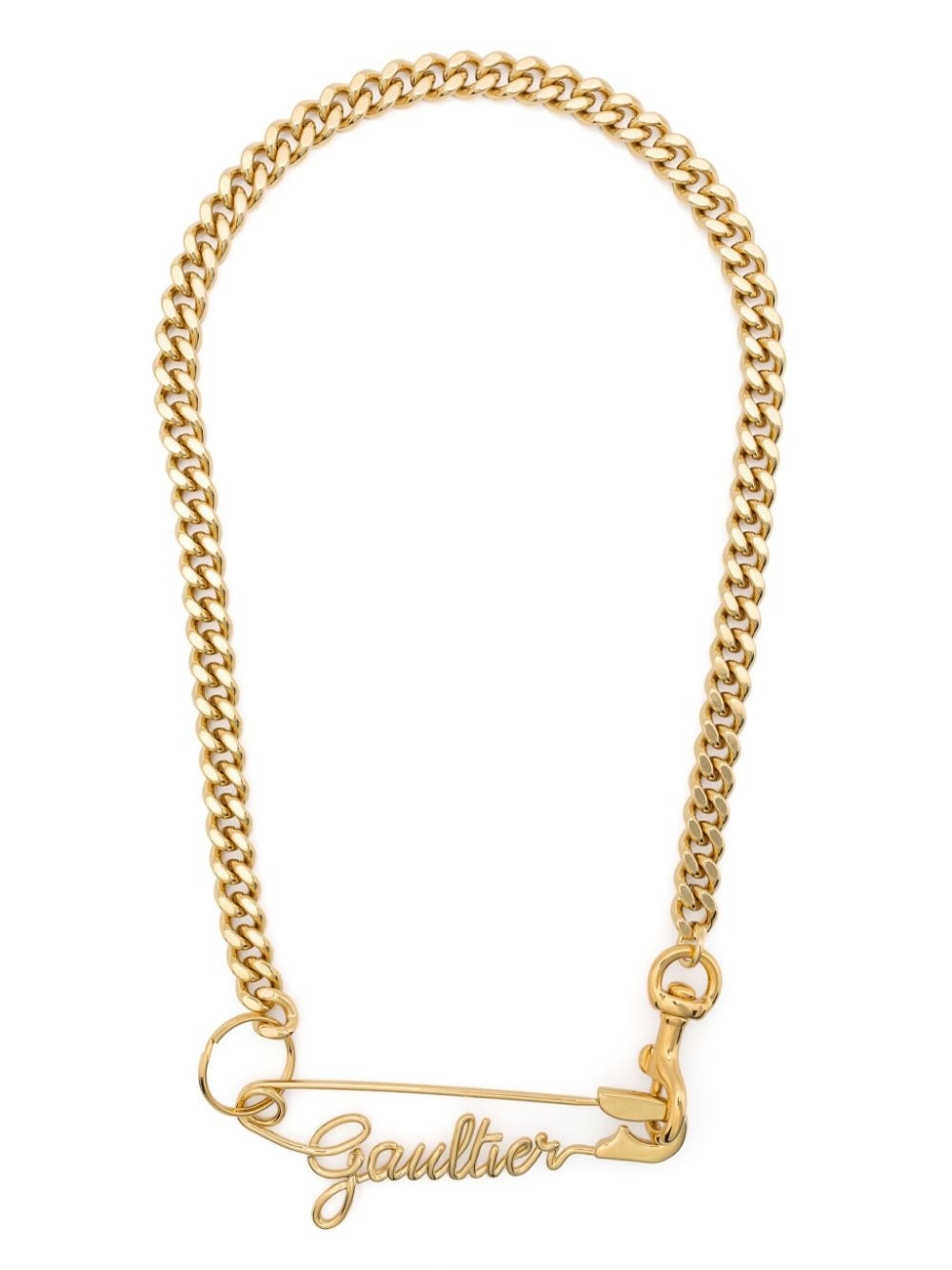 Gaultier Safety Pin chain-link necklace Highlights - Gold-tone - Polished finish - Chain-link detailing - Gold-tone logo lettering - Ring hardware detailing - Bar-pin fastening - Lobster claw fastening - Length: 63cm Imported SIZE & FIT Model measurements Height 5 ft 10 in(1.77 m) Bust/Chest 32.28 in(82 cm) Hips 35.03 in(89 cm) Waist 25.19 in(64 cm) Measurement Length when open 24.8 in(63 cm) WIDTH 0.39 in(1 cm)