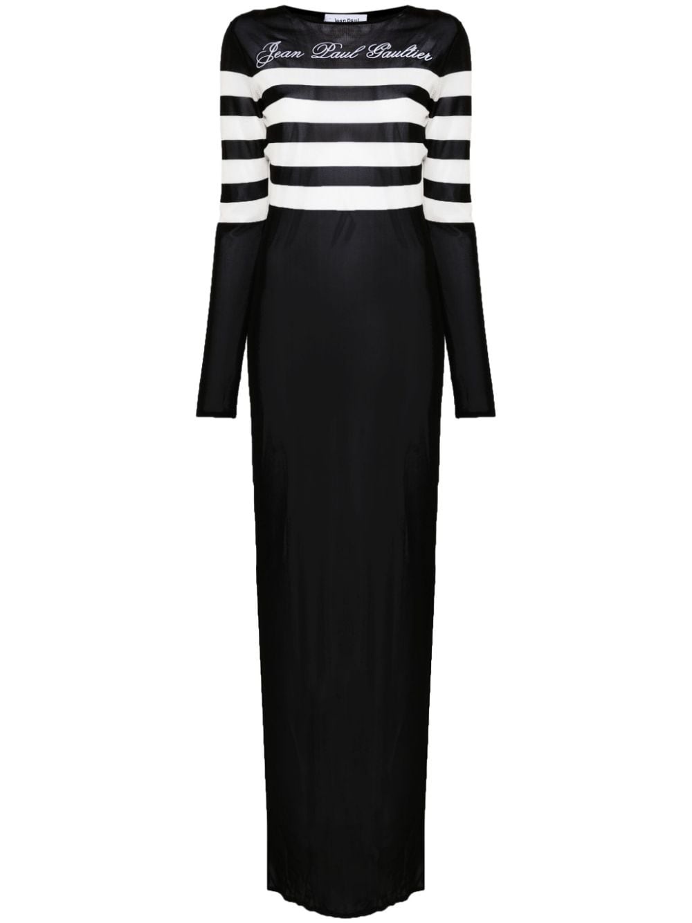 logo-embroidered maxi dress Highlights - Black/white - Fine knit - Semi-sheer construction - Crew neck - Long sleeves - Embroidered logo at the chest - Horizontal stripe pattern - Straight hem - Long length - Unlined Made in Italy Composition Viscose 80%, Polyamide 20% SIZE & FIT Model measurements Height 5 ft 9 in(1.75 m) Bust/Chest 31.88 in(81 cm) Hips 34.64 in(88 cm) Waist 24.01 in(61 cm) Measurement LENGTH 64.56 in(164 cm) WAIST 25.19 in(64 cm) BUST 30.7 in(78 cm) Shoulder Width 14.96 in(38 cm) FittingInformation Designed for a slim fit that sits just away from the body offering a close yet comfortable fit Made from a midweight stretch fabric, this piece offers elasticity and flexibility when worn This piece fits true to size – take your usual size Washing instructions Dry Clean Only