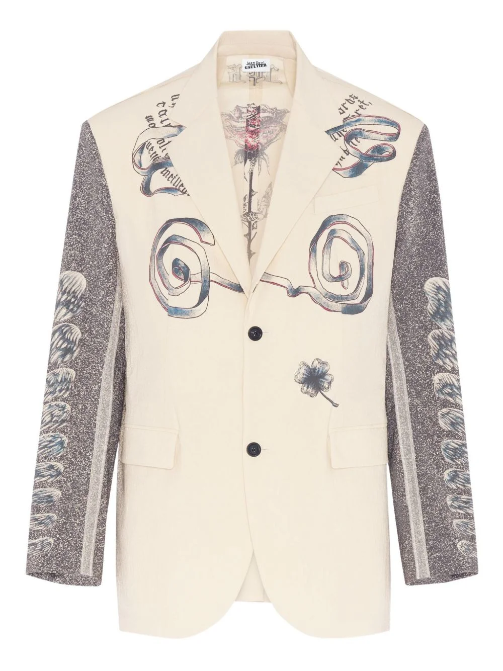 Multi-Tattoo printd blazer Highlights - Ecru - Tattoo print - Button fastening - Two flap pockets - Chest pocket - Contrasting sleeves Made in Italy Composition Outer: Cotton 54%, Polyamide 40%, Spandex/Elastane 6% Lining: Cotton 100% Washing instructions Read Manufacturer Guidelines