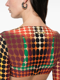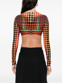 polka dot top Highlights - Orange, blue and brown - Polka dot pattern - Long sleeves - Cropped - Bra detail - Round neck Made in Italy Composition Polyamide 80%, Elastane 20% SIZE & FIT Model measurements Height 5 ft 10 in(1.78 m) Bust/Chest 33.46 in(85 cm) Hips 36.22 in(92 cm) Waist 23.22 in(59 cm) Washing instructions Hand Wash