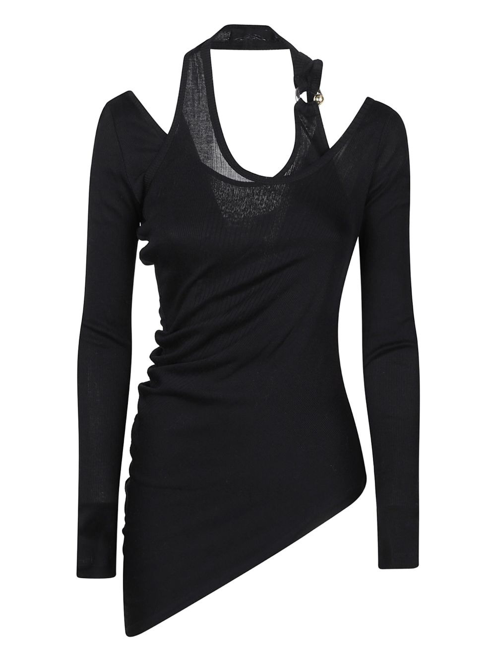 ring-detail asymmetrical top Highlights - Black - Ribbed fabric - Twisted double layer sleeves - Asymmetrical hem - Ring detail - Gold-tone beading Imported Composition Cotton 100% Washing instructions Read Manufacturer Guidelines
