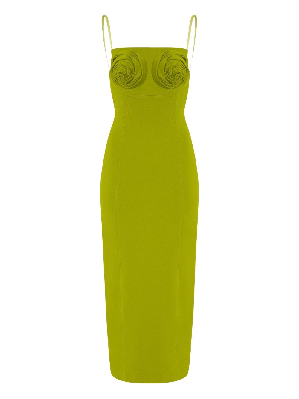 rose-embellished midi dress Highlights - Lime green - Ruched rose detail - Spaghetti straps - Fitted bodice - Straight hem Made in Italy Composition Lining: Polyamide 72%, Elastane 28% Outer: Viscose 78%, Polyamide 16%, Elastane 6%