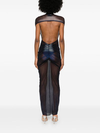 sheer maxi dress Highlights - Navy blue - Open back - Ruched detailing - Logo print embellishment Made in Italy Composition Other fibres 100% SIZE & FIT Model measurements Height 5 ft 11 in(1.8 m) Bust/Chest 32.67 in(83 cm) Hips 35.82 in(91 cm) Waist 25.98 in(66 cm) Measurement LENGTH 57.87 in(147 cm) WAIST 15.74 in(40 cm) BUST 25.98 in(66 cm) Shoulder Width 11.02 in(28 cm) FittingInformation Designed for a close fit throughout Made from a lightweight stretch fabric, this piece offers elasticity and flexibility when worn Washing instructions Hand Wash