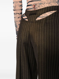 The Thong striped trousers Highlights - Brown - Wool blend - Vertical stripe print - Thong detail - High-waisted - Hook and zip fly fastening - Wide leg - Two side inset pockets - Straight hem Made in Italy Composition Wool 85%, Viscose 14%, Polyester 1% SIZE & FIT Model measurements Height 5 ft 10 in(1.78 m) Bust/Chest 30.7 in(78 cm) Hips 36.22 in(92 cm) Waist 25.59 in(65 cm) Measurement FRONT RISE 11.02 in(28 cm) INSIDE LEG 35.03 in(89 cm) HIPS 40.15 in(102 cm) WAIST 30.7 in(78 cm) FittingInformation Designed with a wide-leg cut, these trousers allow for a close fit at the waist and offer a loose and roomy fit over the leg Made from a midweight non-stretch fabric This piece fits true to size – take your usual size Washing instructions Dry Clean Only