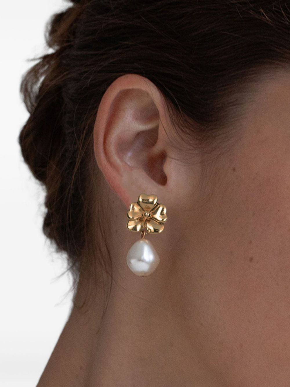 18kt gold plated Luiza drop earrings Highlights - 18kt gold plated - Polished finish - Hammered-effect finish - Floral motif - Drop design - Faux-pearl detailing - Post-back fastening - For pierced ears - These earrings come as a pair. Made in United States