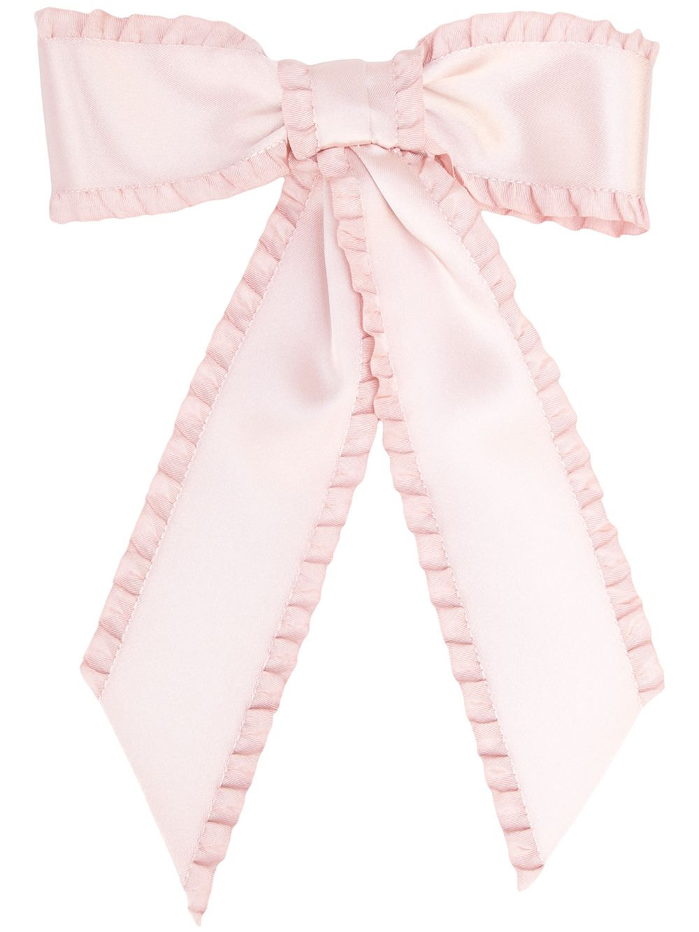Harper bow clip Highlights - Blush pink - Silk satin - Oversize bow detail - Ruffled detailing - Clip fastening Made in United States Composition Body: Silk Satin 100% SIZE & FIT Measurement LENGTH 8.26 in(21 cm) WIDTH 6.29 in(16 cm) Washing instructions Do Not Wash/Do Not Dry Clean