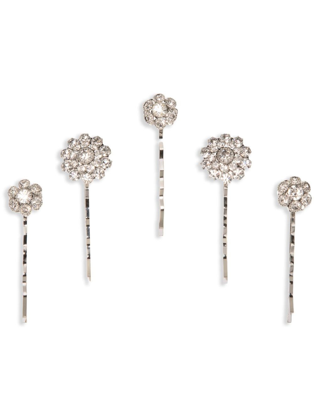 Nora bobby pins (set of five) Highlights - Silver-tone - Rhodium plating - Polished finish - Pin fastening - Floral motif - Crystal embellishment - Set of five Made in United States Composition Rhodium Plated Brass 100%, Synthetic Crystal 100%