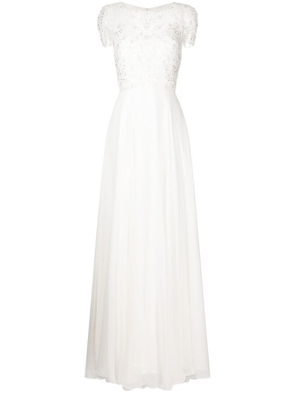 Albertine crystal-embellished gown Cut from fluid silk that cascades to a floor length, this Jenny Packham dress embodies the brand's ethereal aesthetic. The sheer bodice is encrusted in glimmering crystals for a dazzling look that catches the light with each movement. Imported Composition Outer: Silk 100% Lining: Polyester 95%, Elastane 5% Body: Polyester 100% SIZE & FIT Model measurements Height 5 ft 11 in(1.8 m) Bust/Chest 28.34 in(72 cm) Hips 35.43 in(90 cm) Waist 23.62 in(60 cm) FittingInformation This piece fits true to size. We recommend you get your regular size Designed for a close fit at the bust and waist, but loose at the hip Made with a lightweight non-stretch fabric Washing instructions Dry Clean Only